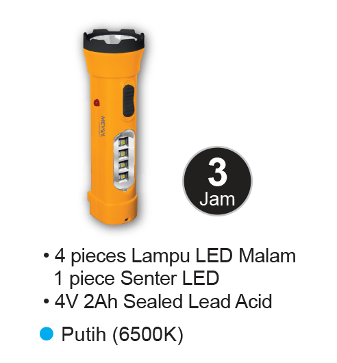 • Durasi Penggunaan : 3 Jam (Lampu Tidur) 1,5 Jam (Senter)