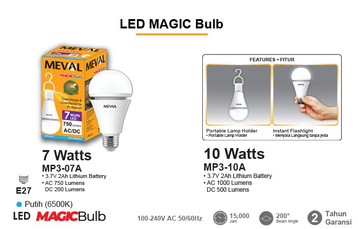 - Sebagai Lampu Darurat. Pada saat aliran listrik ke rumah padam, Lampu Magic Bulb MEVAL akan langsung menyala seketika sehingga rumah Anda tetap terang