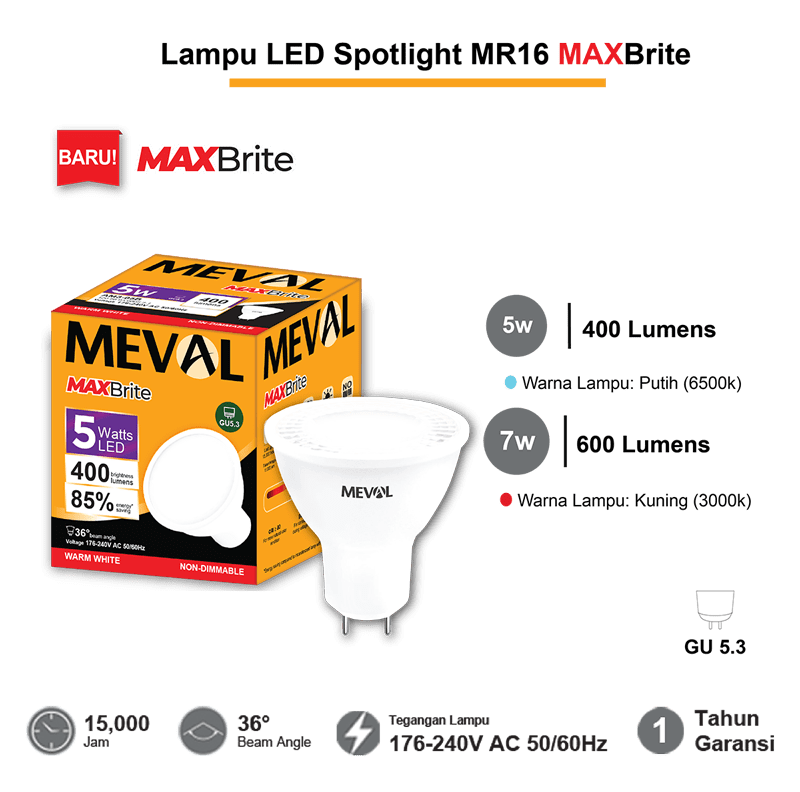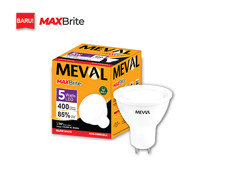 MEVAL LED Spotlight MR16 MAXBrite, lampu spotlight dengan durability yang tinggi yang menghadirkan suasana estetis dengan cahaya kuning tanpa jeda pada ruangan anda.
